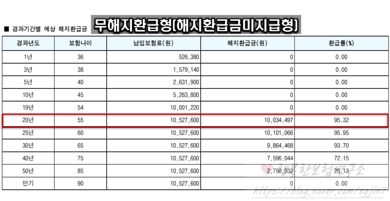 사실 개념은 이름만 잘 봐도 알 수 있어요.해지하면 돌려받을 금액이 없는 보험이라는 뜻인데요.과거에 어머니 세대에서 많이 하셨던 환급형의 반대 개념이라고 할 수 있습니다.돌려받는 비율이 없거나 적어 매달 내는 납입료가 비용으로 사라지게 됩니다.실제로 제안서 하단에 첨부되어 있는 예표를 보면서 설명하겠습니다.