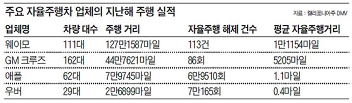 자율주행차 개발의 기술 성숙도를 주요 업체별로 비교하는 데 절대적인 기준이 있는 것은 아니지만 주행거리, 자율주행 해제 건수로 비교해 보면 아래 그림과 같습니다.
