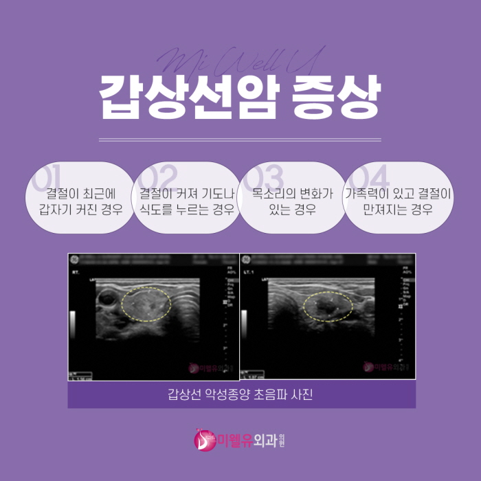 갑상선에 악성종양이 발생하는 경우에는 통증이 없는 단단한 덩어리가 목에서 잡힐 수 있으며 종양으로 인해 압박감(통증)이 발생하여 숨을 들이마시거나 음식을 삼키기 어려울 수 있습니다. 또한 목소리에 변화가 있을 수 있기 때문에 가족 중에 갑상선암 환자가 있었는데 이런 증상이 나타나기 시작하면 꼼꼼한 초음파 검사를 권하고 싶습니다.