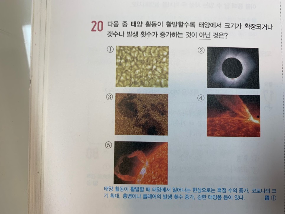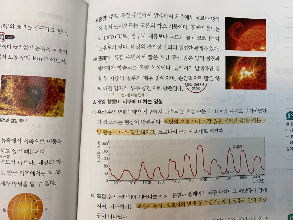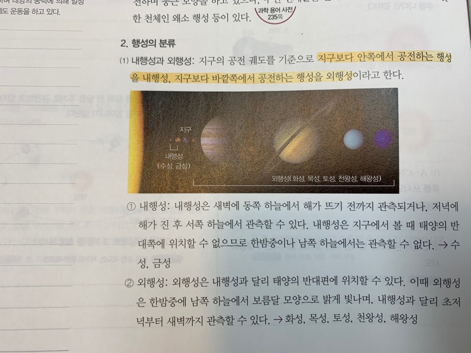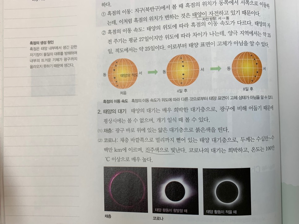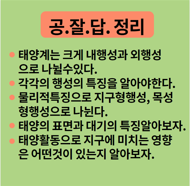오늘은 태양계를 이루는 행성(내행성, 외행성)과 태양의 활동(채층, 홍염, 코로나, 플레어)을 보고 표면의 흑점, 쌀알무늬까지 살펴봤습니다.그림과 관련시켜 이미지화하는 것이 이번 단원에서는 도움이 될 것입니다.