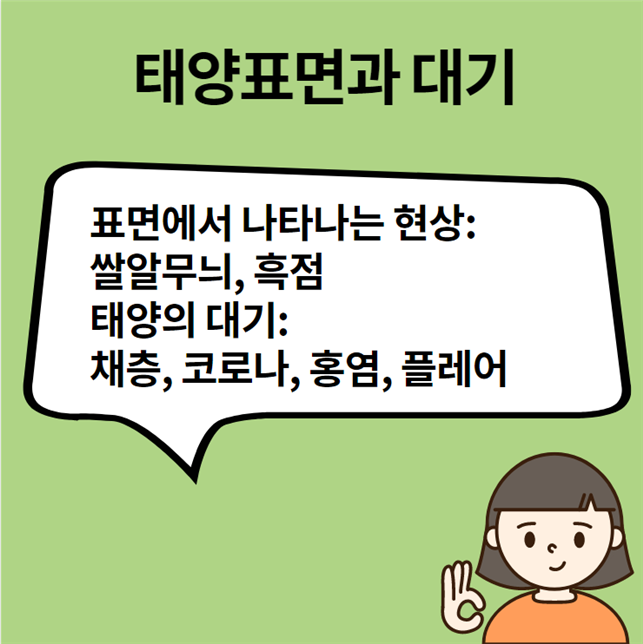 태양 태양에 대해 알아볼까요?태양을 크게 표면, 대기 등으로 나누어 생각할 수 있습니다.