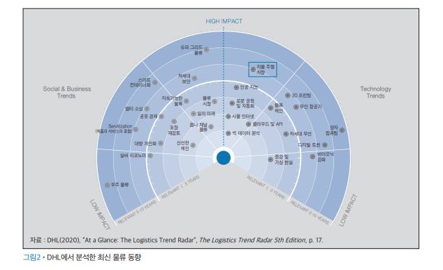 DHL이 정기적으로 제공하는 글로벌 물류 동향 분석과 전망에 따르면 2025년 이전에 물류 분야에 큰 영향을 줄 주요 기술로 빅데이터 분석, 사물인터넷, 로봇 및 자동화, 인공지능과 함께 자율주행차가 포함된다.