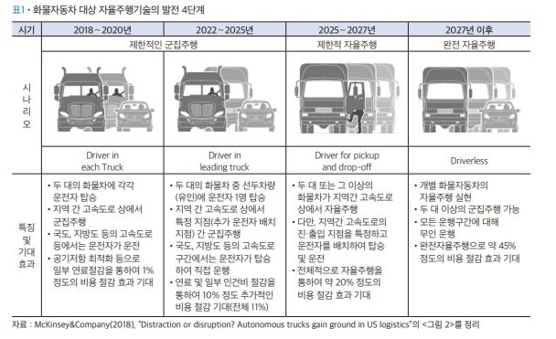 중장거리 간선 수송에서의 자율주행 상용화를 위해 많은 물류기업과 자동차업체들이 고속도로를 중심으로 활발히 시범사업을 진행하면서 상당한 기술 발전이 이뤄져 왔다. 지난 2016년 스카니아는 선두 차량 운전자가 운전하는 군집주행(반자율주행)으로 스웨덴~네덜란드 간 화물운송에 성공했고, 2), 한국에서도 연차별 사업을 통해 군집주행 기술 개발과 적용, 실제 시연 등을 통해 자율주행 화물차 운행을 적극 준비하고 있다. 스트레이티앤(2018)은 자율주행 기술로 화물차 활용이 현재 수준의 약 2.7배 수준까지 증가할 것으로 추정했다.3) 자율주행 기술이 운행시간 제한을 극복시킴으로써 화물차의 회전율을 높이기 위해서다. 이는 화물차 운전자 부족 문제를 해결하는 방안이 될 것으로 기대했다. 또 자율주행 기술은 경로 효율화는 물론 군집주행의 경우에는 공기저항 최소화 등을 통해 연료소비를 최소화함으로써 비용절감과 함께 환경영향에 대한 업계 부담을 줄일 것으로 기대된다. McKiney&Company(2018) 분석팀은 자율주행 화물차 기술 적용을 통해 제한적인 군집주행부터 완전 자율주행 구현까지 10년 정도의 기간을 예상했으며 마지막 단계의 완전 자율주행 적용을 통해 전체적으로 45% 정도의 비용 절감을 예상했다.