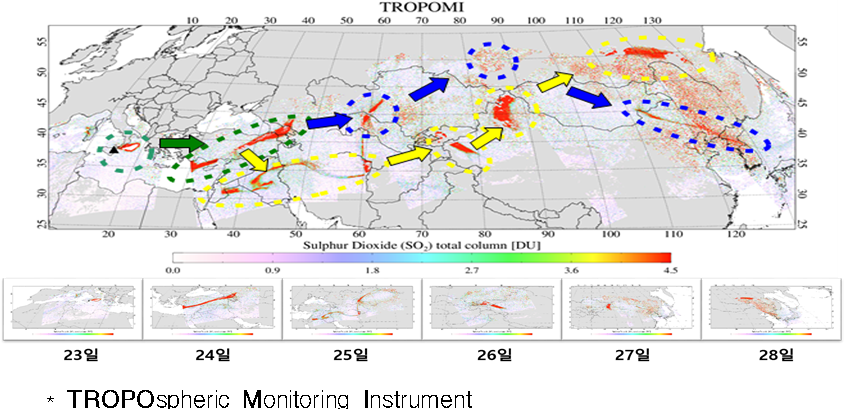 한편 국립환경과학원은 아시아 지역 내로 이동하기까지 하루 1~2회 정도 관측이 가능한 유럽의 저궤도환경위성(TROPOMI*) 자료를 연결해 에토나 화산가스의 움직임을 파악했다.