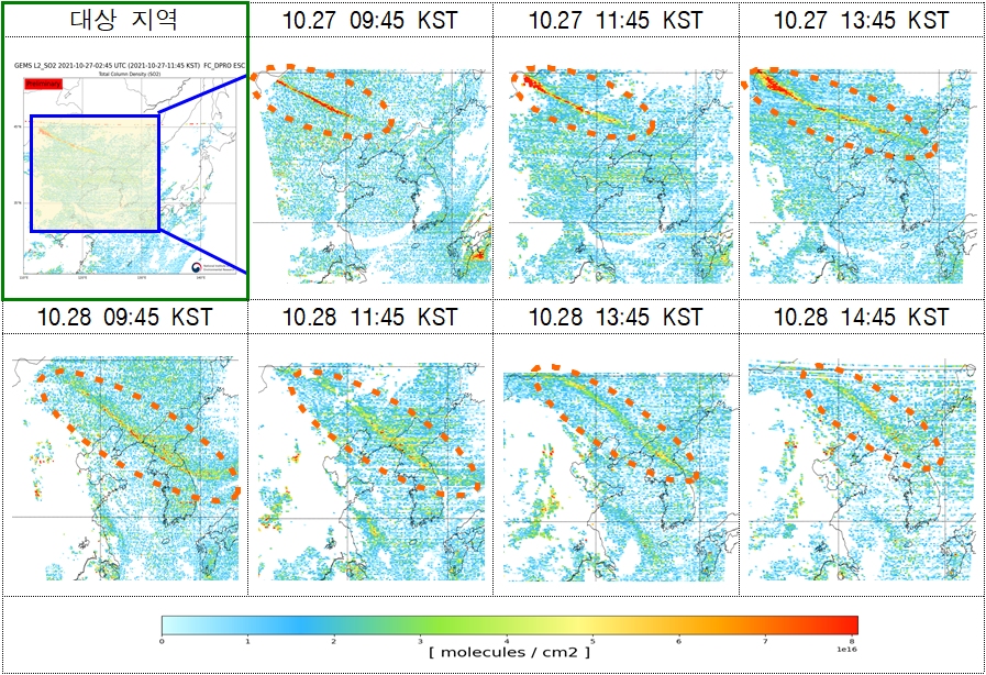 아시아 지역을 매 시간 관측하는 정지궤도 환경위성 영상에는 일부 아황산가스가 10월 27일 한반도 북쪽으로 처음 유입된 뒤 28일 한반도 남쪽으로 이동해 강원 일부 지역 상공을 지나는 모습이 포착됐다.※ 정지궤도 환경위성의 관측 범위는 동서로 일본에서 인도, 남북으로 인도네시아 북부에서 몽골 남부까지이며 20개국 이상의 아시아 국가가 포함된다.