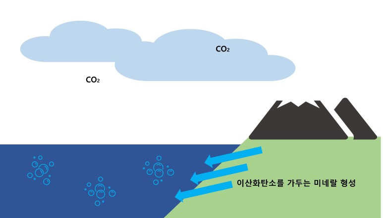 화산 활동으로 대기 중 이산화탄소가 미네랄로 포집되는 과정, 출처 = (제작) 김현수 기자