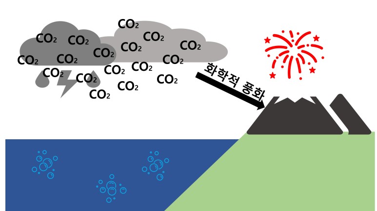 화산 분출에 의해 대기 중으로 분출된 이산화탄소가 다시 제거되는 과정은 지표면에서 암석이 자연스럽게 분해 및 용해되는 화학적 풍화작용(chemical weathering)을 거치게 됩니다. 풍화의 산물인 칼슘이나 마그네슘 같은 성분이 강을 통해 바다로 흘러들어 이산화탄소(CO2)를 가두는 미네랄을 형성하기 때문에 이 과정은 매우 중요하다고 할 수 있습니다. 이러한 피드백 메커니즘이 지질학상 장기간에 걸쳐 대기 중 이산화탄소 농도를 조절하고 그에 따라 기후도 조절하게 된다는 것이 과학자들의 의견입니다.* 풍화작용 : 암석이 물리적 작용이나 화학적 작용에 의해 점차 토양으로 변해가는 현상