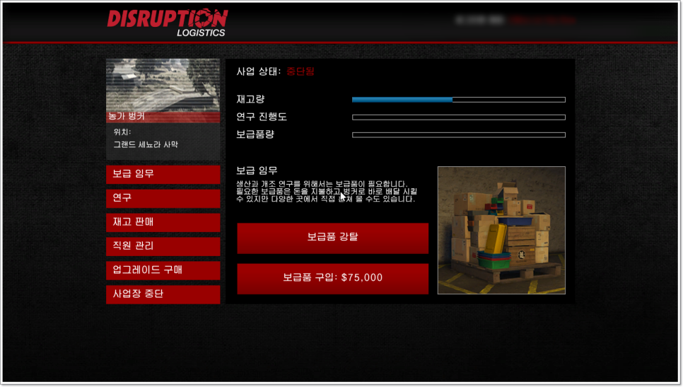 패키지 창고처럼 재고량이 많을수록 단가가 늘어나는 것은 아니기 때문에 재고품을 가득 채워 팔 필요는 없습니다. 보급품을 채워두면 직접 재고품을 생산하기 때문에 그동안 CEO 반입 반출을 진행하거나 패키지 작업을 진행해도 되는 부분입니다. 벙커에 보안 업그레이드 항목이 있다는 것은 생산해 놓은 상품을 도난당하는 상황이 된다는 것인데 50% 이상인 경우에만 발생하기 때문에 보급 즉시 재고를 판매하는 것이 좋습니다.격납고를 통해 약탈한 패키지를 묻으면서 재판매한다.재판매를 통해 수익을 올리고 시큐어 에이전시의 스페셜 패키지 하드 버전으로 보면 된다.