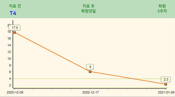 치료 전 17.8 / 치료 후퇴원일 6.0 / 퇴원 3주차 (약물 단약 상태) 2.3 [정상 수치 범위 0.8-4.7]