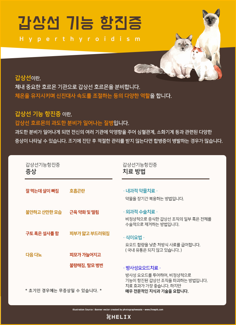내원한 환자는 주치의병원에서 4년 전 갑상선기능항진증과 심근비대증(HCM)을 진단받았고 이후 꾸준히 갑상선약, 심장약을 투약해 왔습니다.최근 환자가 다시 불안해하면서 갑상선 호르몬 수치가 다시 증가하는 것으로 확인됐습니다.갑상선약을 조정하였으나 호르몬 수치가 정상적으로 회복되지 않아 주치의와 상담 후 방사성 요오드 치료를 위해 헬릭스 동물 메디컬센터에 내원하게 되었습니다.갑상선 기능 항진증은 주로 어떤 질병인 것입니까?고양이들, 노령고양이에게 흔히 발생하는 갑상선기능항진증(갑기항)은 갑상선호르몬 과다분비가 일어나는 질병입니다.
