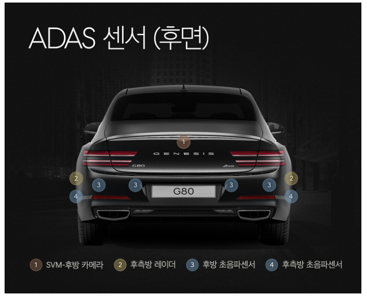 그림 1-2 출처 : brunch.co.krGV80과 G80에는 위 그림과 같이 22개의 카메라, 레이더, 센서 등을 장착했으며 카메라, 레이더 등은 주행과 관련된 역할을 많이 하며 초음파 센서류는 주차와 관련된 역할을 많이 한다.