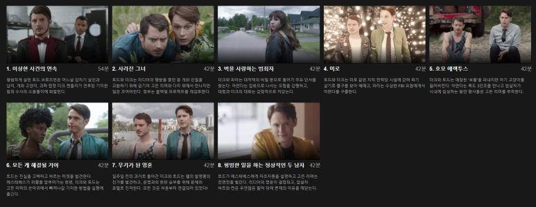 이미지 출처 : 넷플릭스 공식 홈페이지 평범한 벨보이 토드와 괴짜 탐정 다크젠틀리가 끔찍한 살인사건과 실종사건에 휘말리게 되면서 겪는 기상천외한 이야기를 담은 시리즈 출처 : 네이버 소개글 2017년 작성한 리뷰를 바탕으로 재작성했습니다.- 좀 어수선한(?) 미드 다크젠트리의 전체론적 탐정사무소 장르는 SF+판타지+코미디+@짬뽕 처음에는 뭐가 뭔지 몰라 등장인물을 외우는 것도 힘들지만 보면 볼수록 빠져드는 드라마.8부작 안에 정말 많은 이야기가 담겨 있다.자세한 스토리는 스포일러가 되니까 등장인물만 좀 나열해 보자.(등장인물 나열만 해도 반나절)