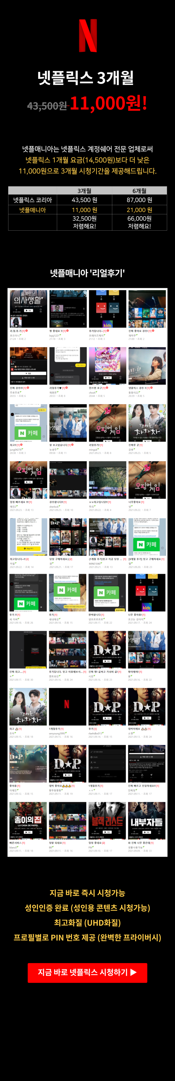 따라서 똑똑한 분들은 같이 보는 사람들을 모아서 4명이서 돈을 나눠 시청하는 분들도 계시는데, 각자 4명이서 돈을 나눠서 내면 더없이 좋겠지만, 같이 볼 친구들을 모아 설득해야 하는 번거로움이 크기 때문에 대다수는 그냥 혼자 한 달 요금을 내고 시청하는 분들도 꽤 많은 것으로 알고 있습니다. 이렇게 불편한 사항을 해결하는 방법이 넷플릭스 애니메이션 추천 2019 저렴하게 보는 방법 계정을 공유하고 시청하는 것입니다. 3개월에 11000원이고 6개월은 21000으로 프리미엄 1개월치 금액도 안되는 비용으로 3개월을 볼 수 있는 게 참 좋은 것 같아요. 그렇기 때문에 앞으로는 제가 넷플릭스를 혼자 결제해서 다 같이 볼 주변 사람을 찾을 필요가 없고 편하게 제가 보고 싶은 만큼 보고 재연장을 해도 되고 더 이상 원하지 않으면 연장하지 않아도 되는 방식이라 편합니다.