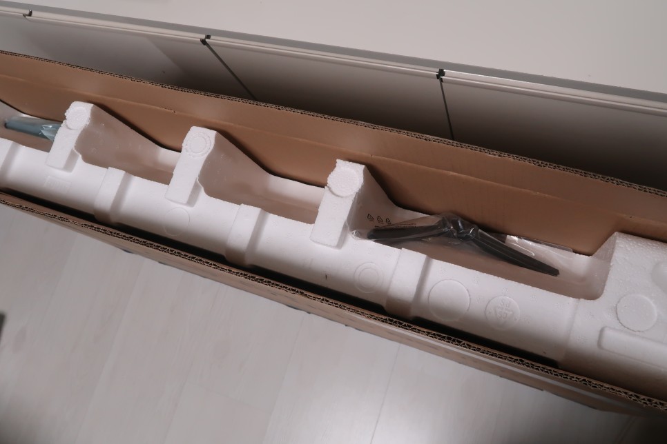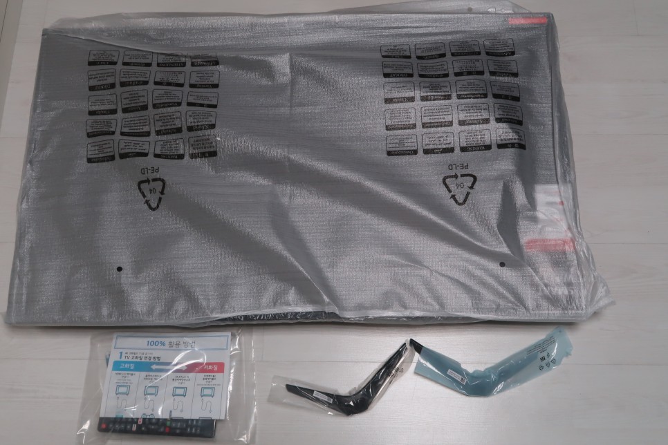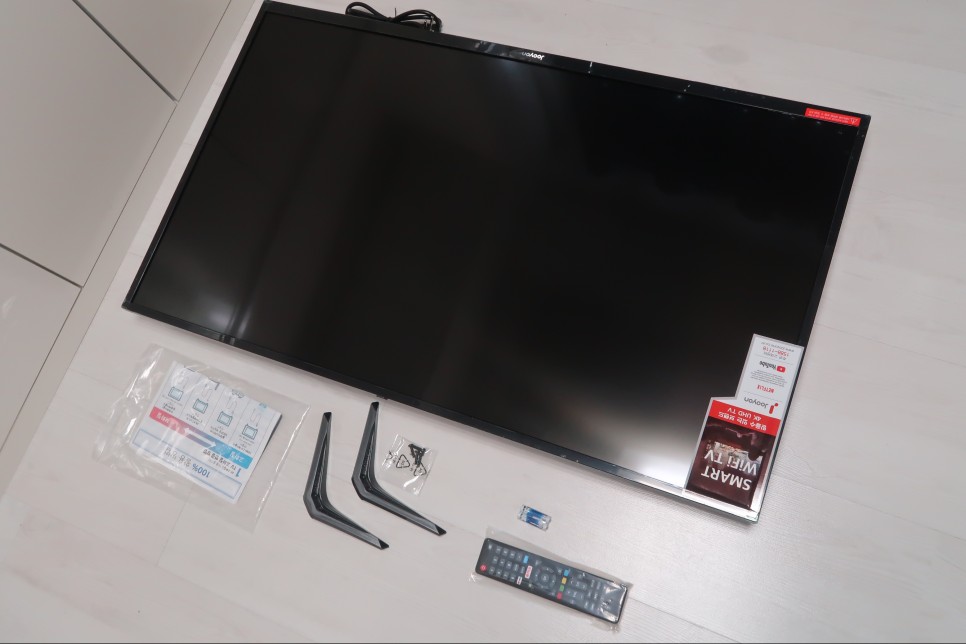 구성품은 정말 단순합니다. TV 패널부와 하단 스탠드, 그리고 설명서와 리모컨이 전부입니다.