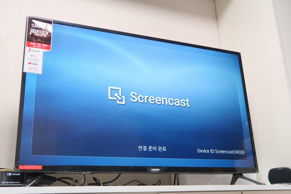 주영 스마트 와이파이 TV 내에 내장된 Screencast 스크린캐스트 앱을 실행하면 ‘연결 준비 완료’라는 문자와 함께 우측 하단에 디바이스 ID가 표시됩니다.