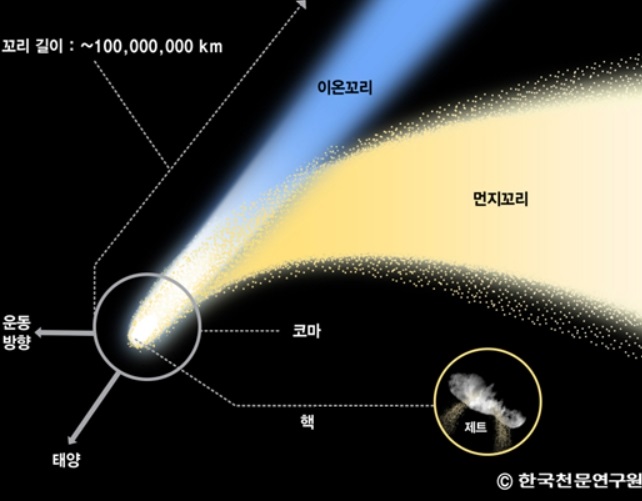 혜성의 몸체는 핵(Nucleus)이라고 불립니다.암석과 얼음이 얽힌 형태로 작은 것은 지름 100미터 정도에서 300킬로미터까지 천차만별입니다.전형적인 혜성핵 반사율은 0.04로 태양계에서 가장 어두운 천체에 속합니다.(아스팔트 반사율 0.07) 태양에서 멀리 떨어져 있을 때는 핵만 존재하지만 태양에 가까워질수록 온도가 높아져 핵 표면의 먼지와 얼음이 증발하게 됩니다.증발한 먼지와 얼음은 지구의 대기처럼 핵 표면을 둥글게 감싸게 되는데 이는 팽이(Coma)라고 합니다.태양에 더 가까워지면 태양풍과 복사압에 의해 핵 표면 물질이 기화되어 꼬리(Tail)가 발생합니다.혜성의 꼬리는 이온 꼬리와 먼지 꼬리로 나뉘는데 가벼운 이온 꼬리는 태양풍의 영향으로 태양과 반대 방향으로 형성되고 먼지 꼬리는 혜성 궤도의 영향으로 곡선 형태를 보입니다.