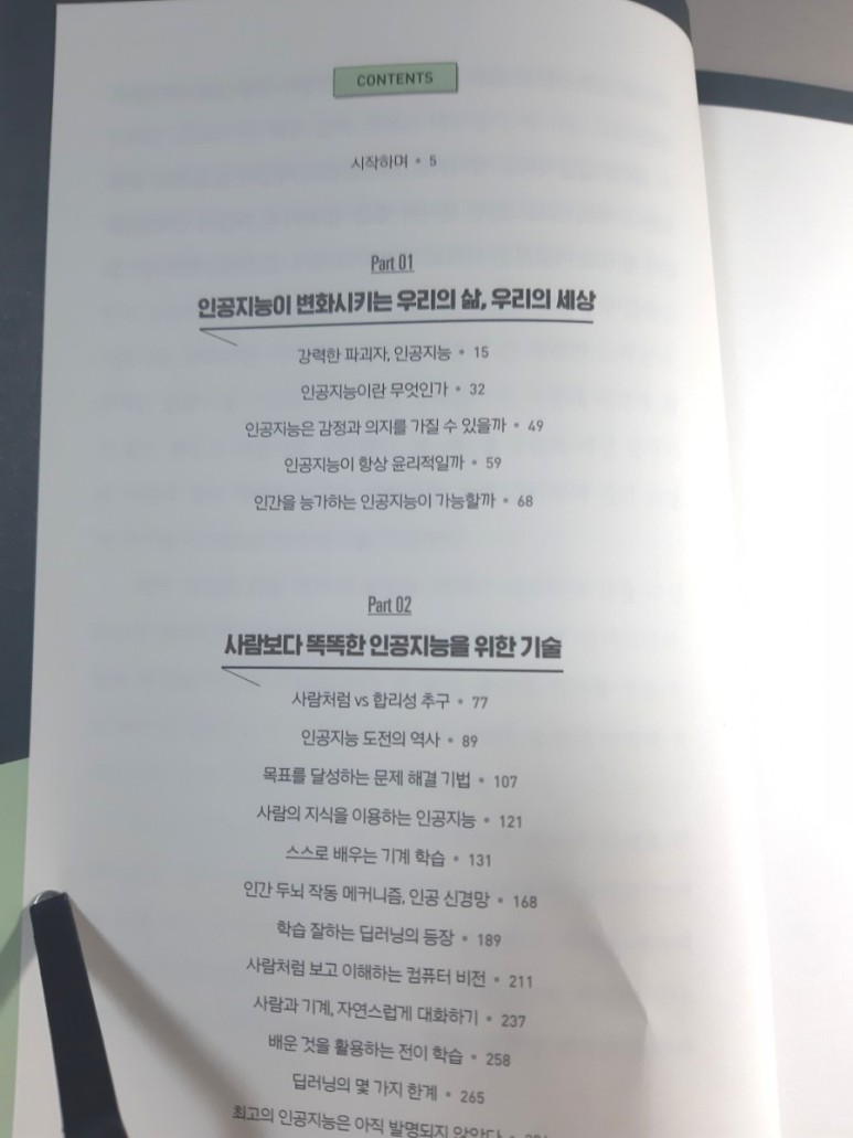 이 책은 총 3개의 파트로 이루어져 있으며 첫 번째 파트에서는 인공지능이 변화시키는 우리의 삶, 우리의 세계가 어떻게 변화하는지 말해줍니다. 두 번째 파트는 사람보다 똑똑한 인공지능을 위한 기술 학습을 잘하는 딥러닝 등장 딥러닝의 몇 가지 한계에 관해 나오고 있으며, 세 번째 파트에서는 인공지능을 지배하는 자, 미래를 지배한다. 인공지능 시대의 시민 교육은 어떻게 이루어져야 하며 세상을 넓고 유리하게 만드는 인공지능에 대해 나오고 있습니다.
