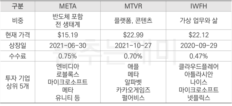 신한에서 분류한 메타버스 ETF는 META, MTVR, IWFH 입니다.