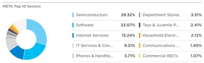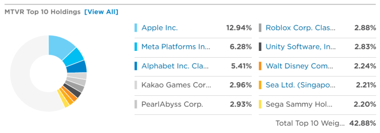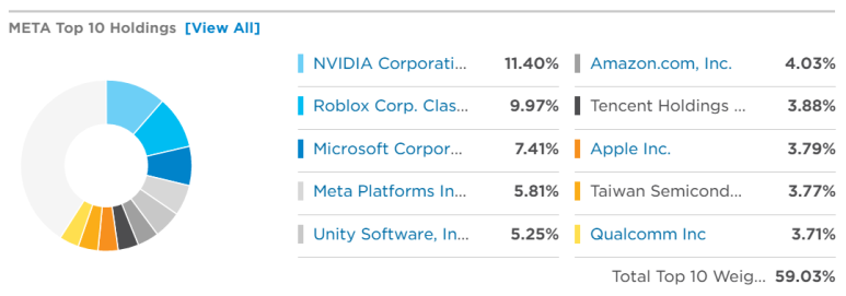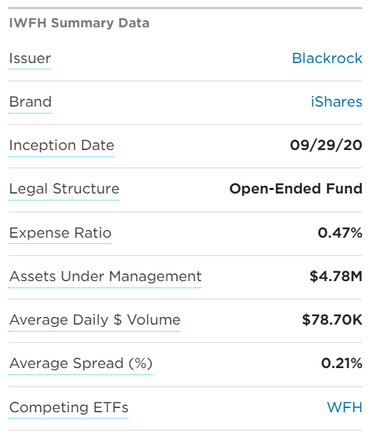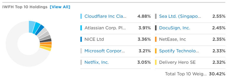 IWFH는 가상 업무와 삶이 관련된 ETF로 META, MTVR과는 성격이 조금 다르지만 메타버스 수혜가 예상되는 종목들로 구성됐다고 합니다.