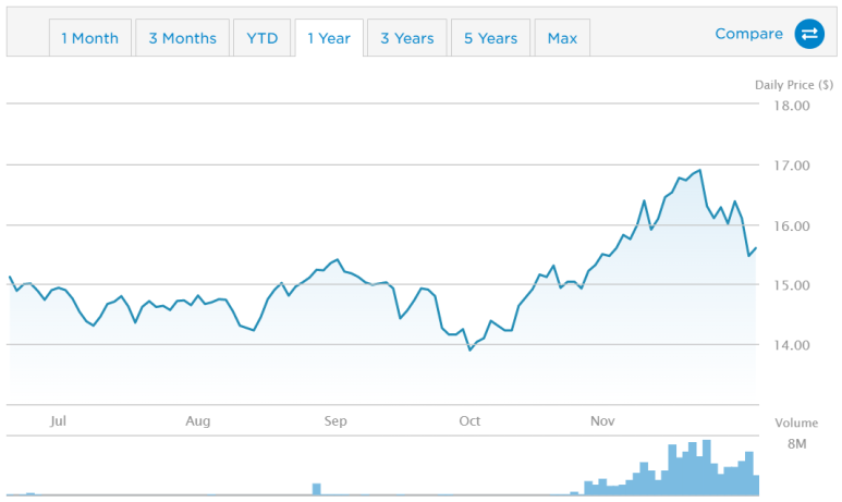 10월 말부터 거래량이 크게 늘었네요.현재 15.19달러로 마감되었습니다.