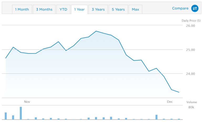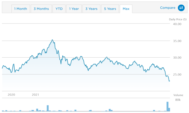 현재 22.12달러로 마감했습니다.완만한 하향세였죠.
