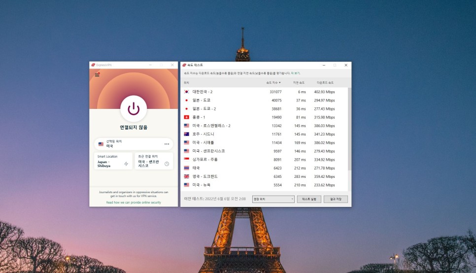Express VPN에서는 자체 속도 테스트도 지원해 테스트 결과 한국에서 가까운 일본이 한국 다음으로 빠르고 홍콩, 미국, 호주 역시 좋은 속도로 이용할 수 있다.