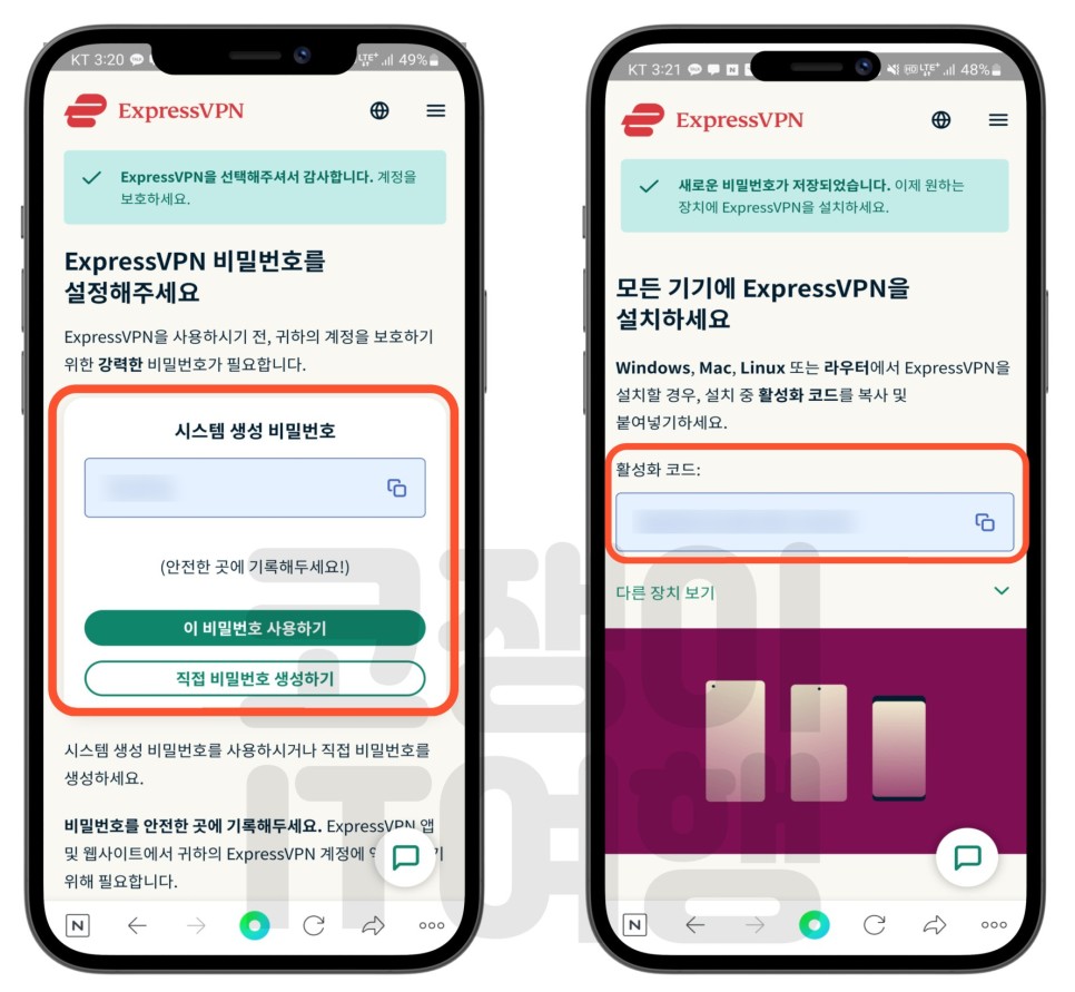 expressvpn에 가입하면 비밀번호 설정을 하게 되고 활성화 코드가 나오는데 이를 잘 보관해야 나중에 다른 기기에서도 로그인이 가능해진다.