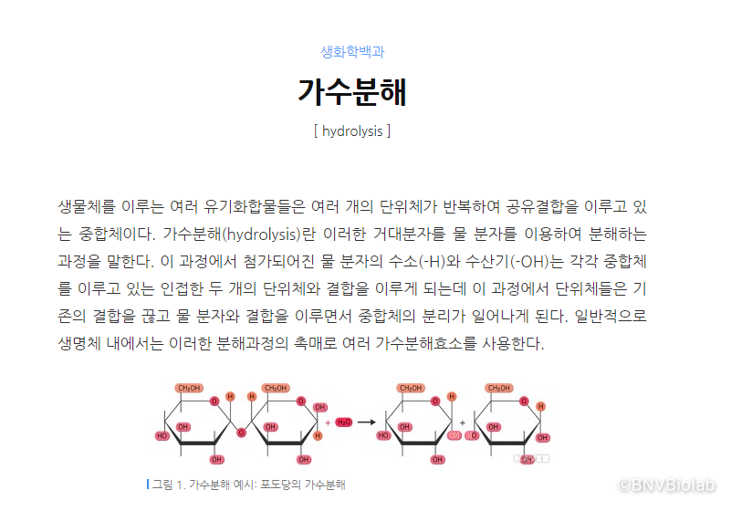 네이버 지식백과에서 발췌한 ‘가수분해’ 생물체를 이루는 여러 유기화합물은 여러 단위체가 반복적으로 공유결합을 형성하고 있는 중합체다. 가수분해(hydrolysis)란 이러한 거대 분자를 물 분자를 이용하여 분해하는 과정을 말한다. 이 과정에서 첨가된 물분자의 수소(-H)와 수산기(-OH)는 각각 중합체를 형성하고 있는 인접한 2개의 단위체와 결합하게 되는데, 이 과정에서 단위체는 기존의 결합을 끊어 물분자와 결합을 이루면서 중합체의 분리가 일어나게 된다. 일반적으로 생명체 내에서는 이러한 분해 과정의 촉매로 복수의 가수분해효소를 사용한다. 그림 1. 가수분해 terms.naver.com