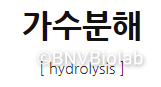 쉽게 말해 물이 첨가되면서 일어나는 ‘분해’ 반응입니다.가수분해라는 한글 밑에 영어도 봐주세요. 보이는 대로 읽어 보겠습니다:)