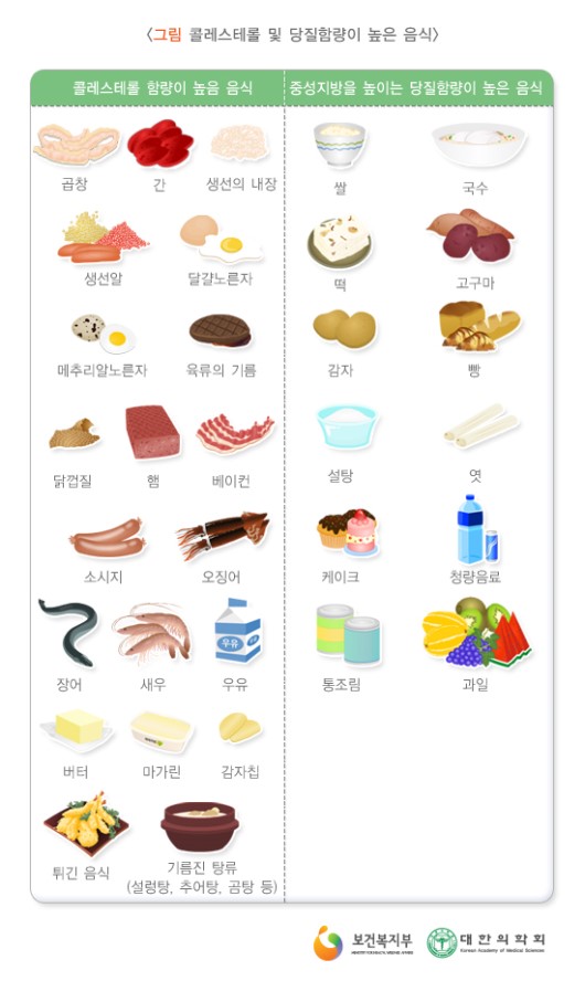 콜레스테롤 및 당질 함량이 높은 음식