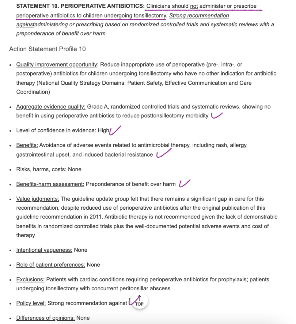 이 지침에서는 편도절제수술 전/중간/후에 항생제를 루틴에 사용할 것을 권고하지 않는다. 예외 : 고열, 심장 기저질환, 편도 주위의 종기 등.그 이유로는 항생제 사용 benefit(수술 후 출혈 및 사망 위험 감소)보다 harm(항생제 부작용, 항생제 내성 우려)이 크기 때문이다.