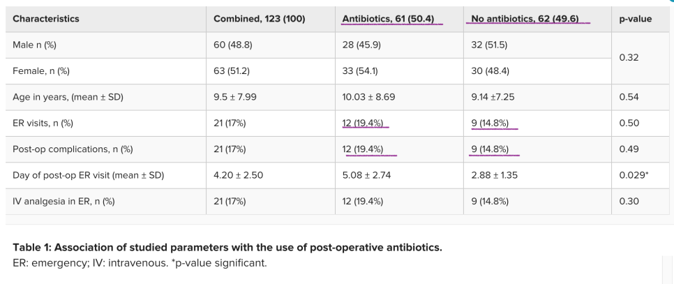 사우디아라비아 병원에서 2018~2019년 123명의 청소년 환자를 대상으로 편도절제술 이후 환자 취향에 따라 항생제 처방을 원하는 군과 원치 않는 군을 1:1로 나눠 비교한 prospective 스터디 결과다.항생제를 복용한 군과 복용하지 않은 군을 비교했을 때 수술 후 compplication에는 유의미한 차이가 없는 것으로 나타났다. N 수만 비교하면 오히려 항생제를 복용한 군에서의 응급실 방문 횟수도 많고 complication도 더 많았던 게 신기하다. (이 연구의 limitation : smallsampesize)