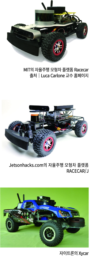 자율주행 소프트웨어 개발을 타깃으로 모형차를 만드는 프로젝트로는 미국 MIT 대학의 ‘Racecar 프로젝트’와 엔비디아 오픈소스 프로젝트 커뮤니티(Jetsonhacks.com)의 ‘RACAR/J 프로젝트’가 유명하다. 국내에서는 임베디드 솔루션 전문회사인 한컴MDS와 자율주행 자동차 및 로봇 개발사인 자이트론이 공동으로 개발하는 ‘AIAutoCAR(Xycar) 프로젝트’가 있다. MIT와 Upenn대학에서는 모형차를 제작하는 과정을 동영상으로 인터넷에 공개하고 있으며 프로그램도 오픈소스로 만들어 제한 없이 공개하고 있다. 학생들과 개발자들은 손쉽게 관련 자료를 참고해 직접 DIY 방식으로 모형차 하드웨어를 제작할 수 있고 오픈소스인 리눅스와 ROS(RobotOS)를 기반으로 개발하는 방법을 공개하고 있어 소프트웨어 구현도 쉽게 가능하다.