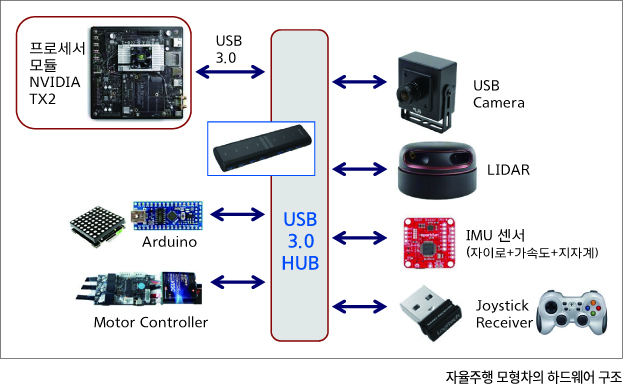 모형차는 실차 대비 1/10 비율로 축소한 것으로 크기도 작아 스펙과 성능이 떨어지지만 자율주행 기술 구현에 필요한 센서를 갖췄으며 실차와 최대한 비슷하게 작동할 수 있도록 작은 부분까지 세심하게 설계됐다. 복잡하고 계산량이 많은 주행제어 인공지능 소프트웨어가 원활하게 구동될 수 있도록 GPU가 지원되는 고성능 인공지능 프로세서, 카메라, 깊이카메라, IMU, 라이더, 초음파센서 등 주변 환경정보 수집을 위한 다양한 센서를 장착한다. 차량의 속도와 스티어링 제어는 휠모터와 스티어링모터를 통해 이뤄진다. 배터리와 모터로 구성되는 구동부를 정밀하게 제어하기 위해 오픈 하드웨어 모터 제어기(ESC-Electronic Speed Controller)가 장착되며 와이파이 무선랜, 유선랜, HDMI, SSD, 아두이노 등 응용개발과 개발 편의성 향상 목적의 다양한 주변 장치들이 장착된다. 또 주변 장치의 간단한 추가 확장을 지원하기 위해 메인 인터페이스 방식으로 고속 USB 3.0 표준이 채택된다.